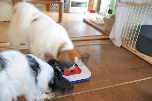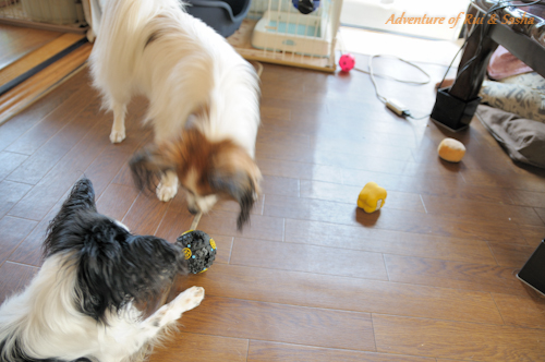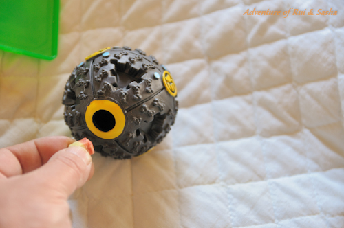 ま、こうして転がすと中に詰めたオヤツがこぼれ出るってヤツです。