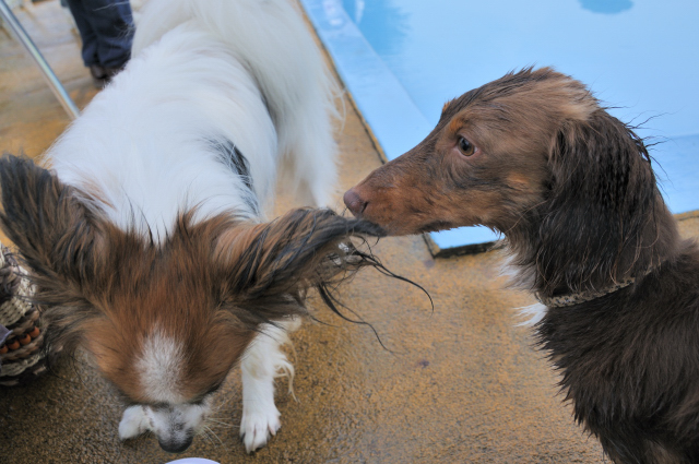 と、全身ずぶ濡れになって遊んでたパピヨンちゃんに、馬鹿にされてます。