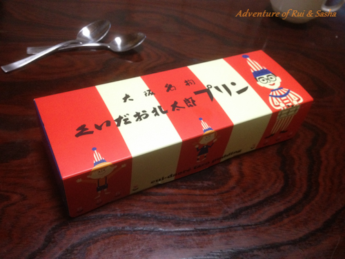 プリンがくいだおれ太郎の帽子に包まれてます。