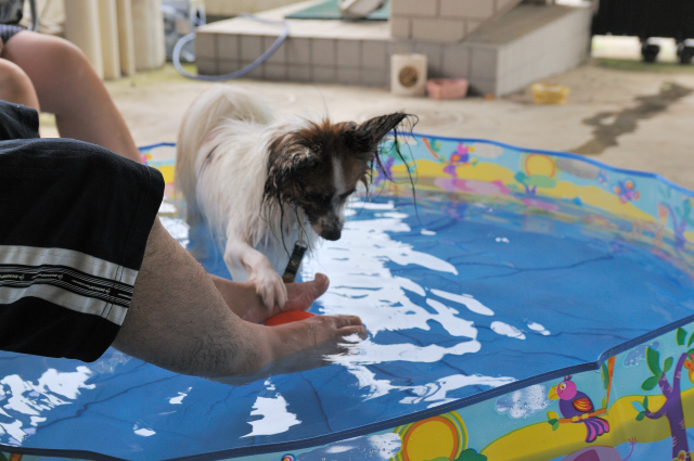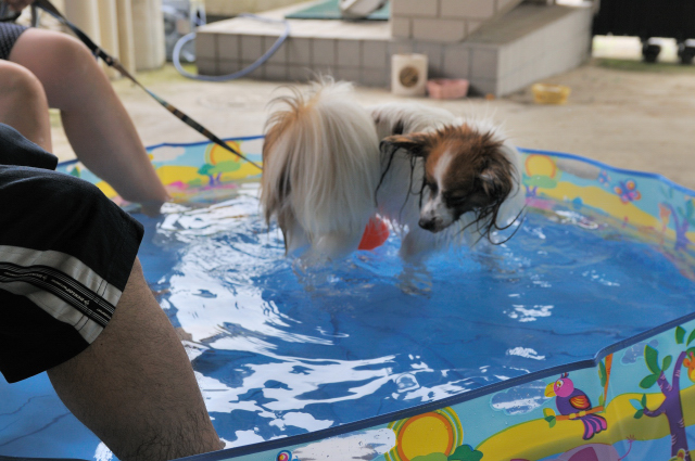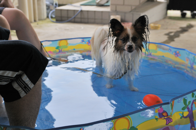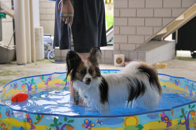 さっそく、プールに水をためて、ルイを連れてきました。