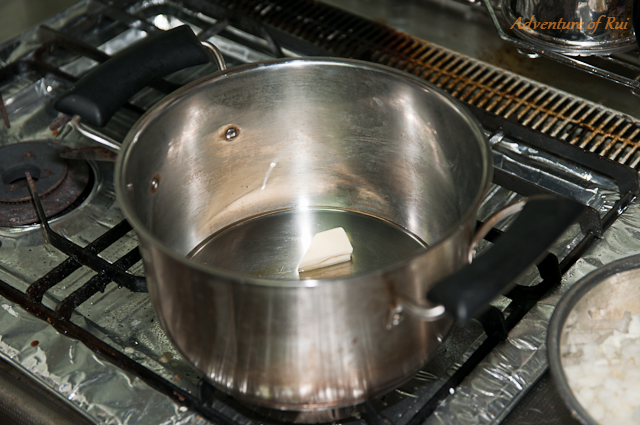 鍋に、サラダ油を適量と、バターを1片投入して火をかけます。(←弱火です)