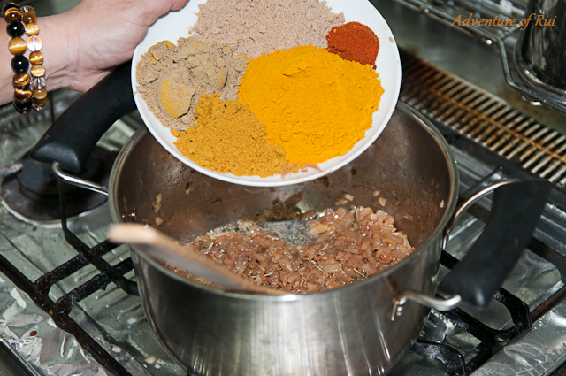 油にスパイスの香りを移します。この間は弱火で炒めます。